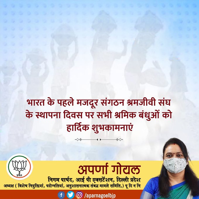 भारत के पहले मजदूर संगठन श्रमजीवी संघ के स्थापना दिवस पर सभी श्रमिक बंधुओं को हार्दिक शुभकामनाएं – अपर्णा गोयल…
