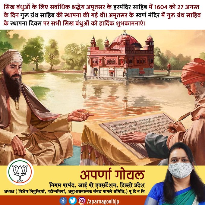 अमृतसर के स्वर्ण मंदिर में गुरू ग्रंथ साहिब के स्थापना दिवस पर सभी सिख बंधुओं को हार्दिक शुभकामनाएं – अपर्णा…
